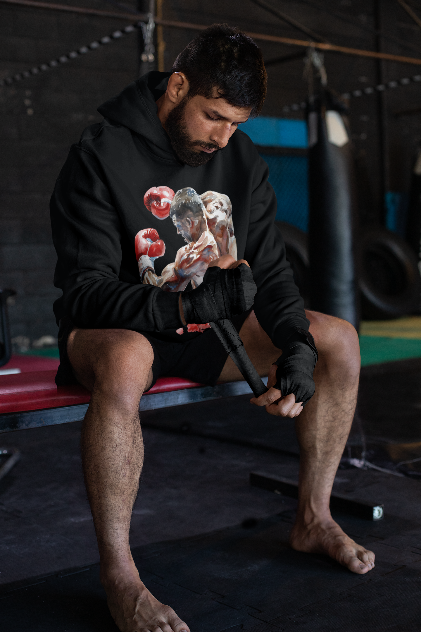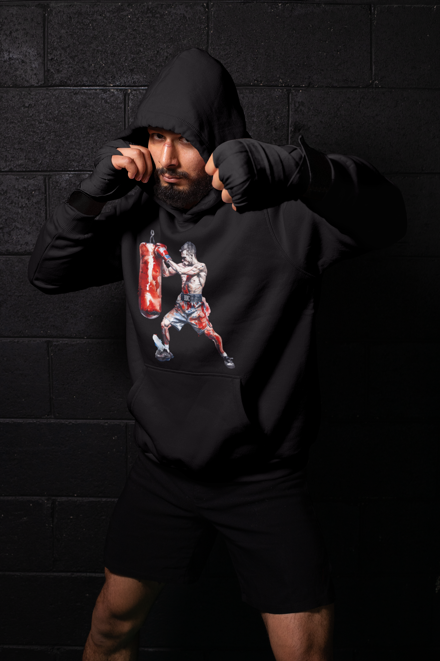 Premium boxer throwing right hook red shorts boxing hoodie — heavyweight cotton-blend fleece with double-lined hood, ribbed cuffs, and bold graphic print. Available in Black. Sizes S to 3XL. The perfect boxing gift for fighters and fans alike.