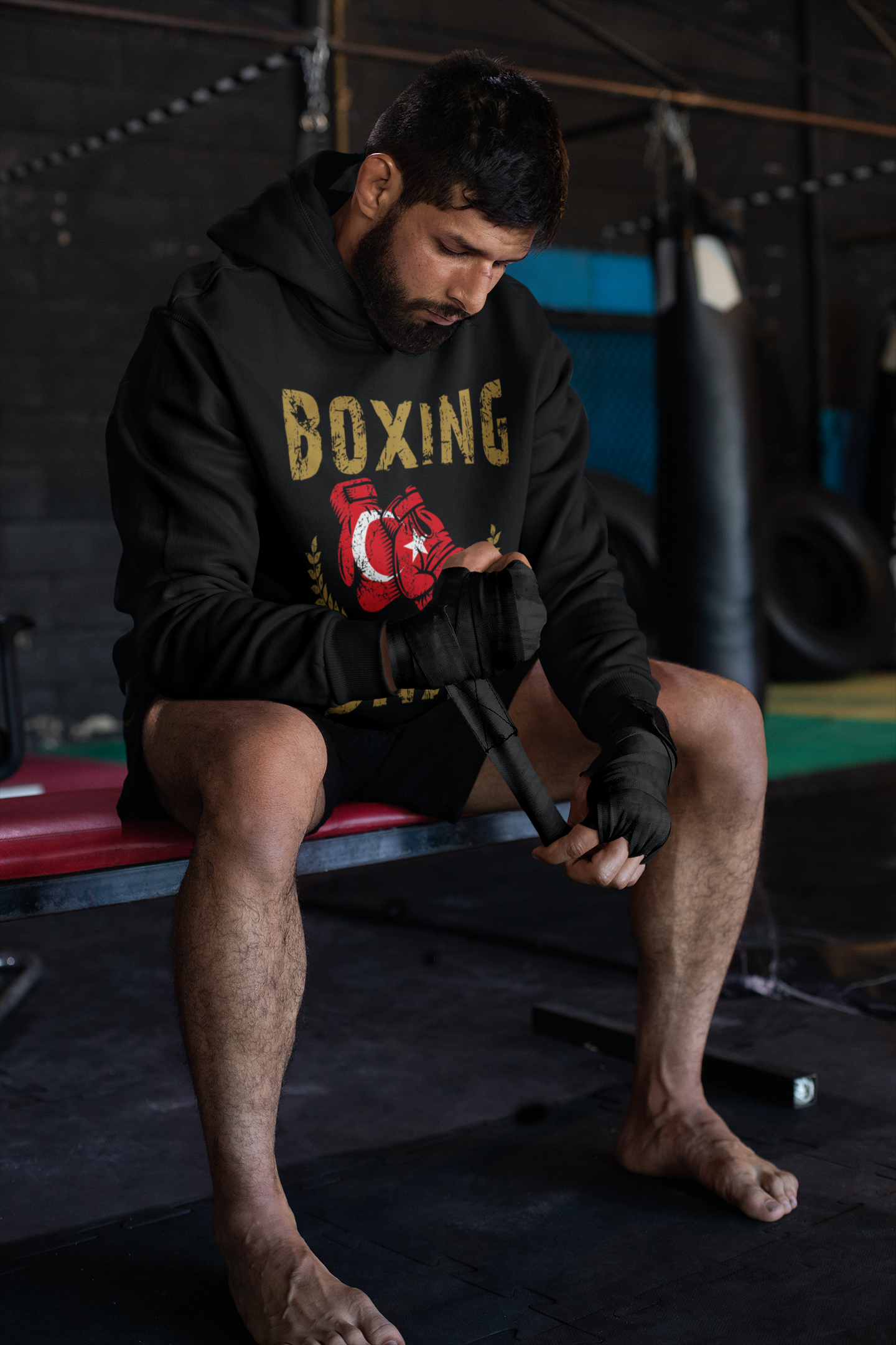 Premium boxing gold gloves hoodie — heavyweight cotton-blend fleece with double-lined hood, ribbed cuffs, and bold graphic print. Available in Black. Sizes S to 3XL. The perfect boxing gift for fighters and fans alike.