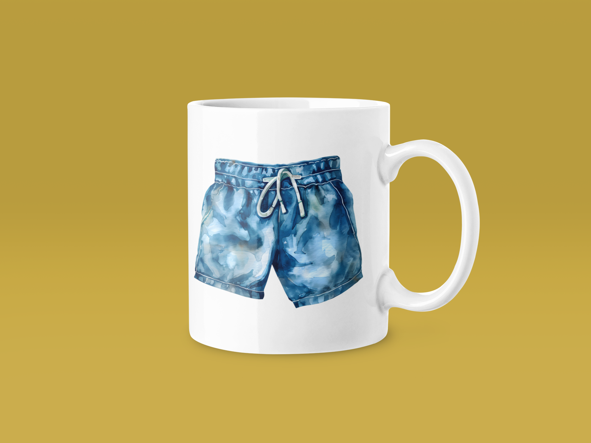 Blue denim shorts with drawstring occupy the mug’s centre, illustrated using watercolour and tie-dye effects that add visual texture and movement to the fabric. Realistic stitching and fit details make the shorts feel authentic and relatable.