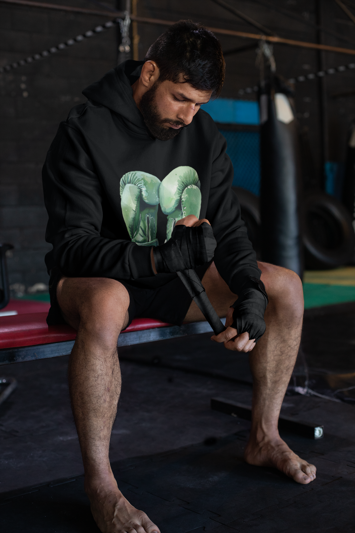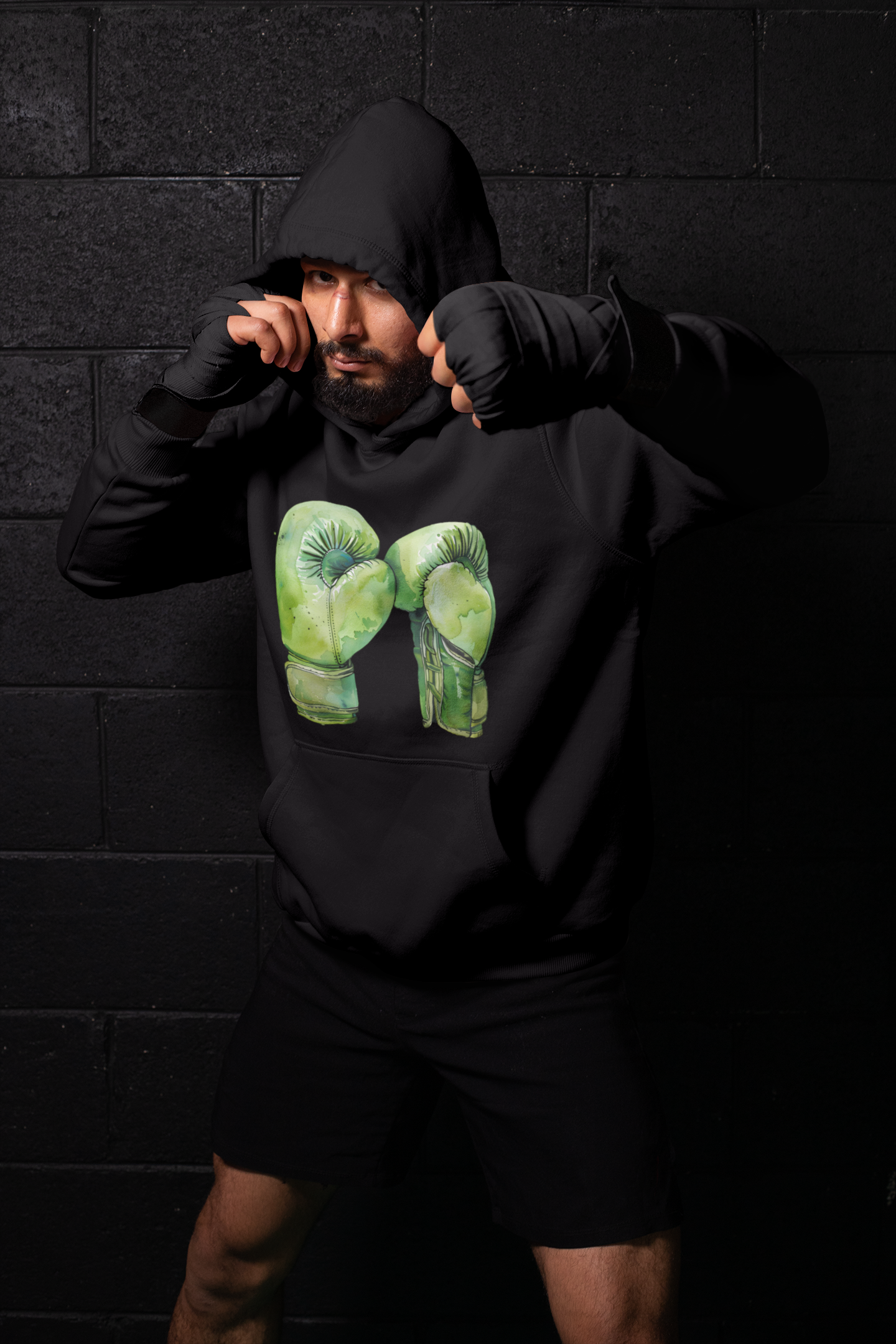 Premium green boxing gloves crossed side hoodie — heavyweight cotton-blend fleece with double-lined hood, ribbed cuffs, and bold graphic print. Available in Black. Sizes S to 3XL. The perfect boxing gift for fighters and fans alike.