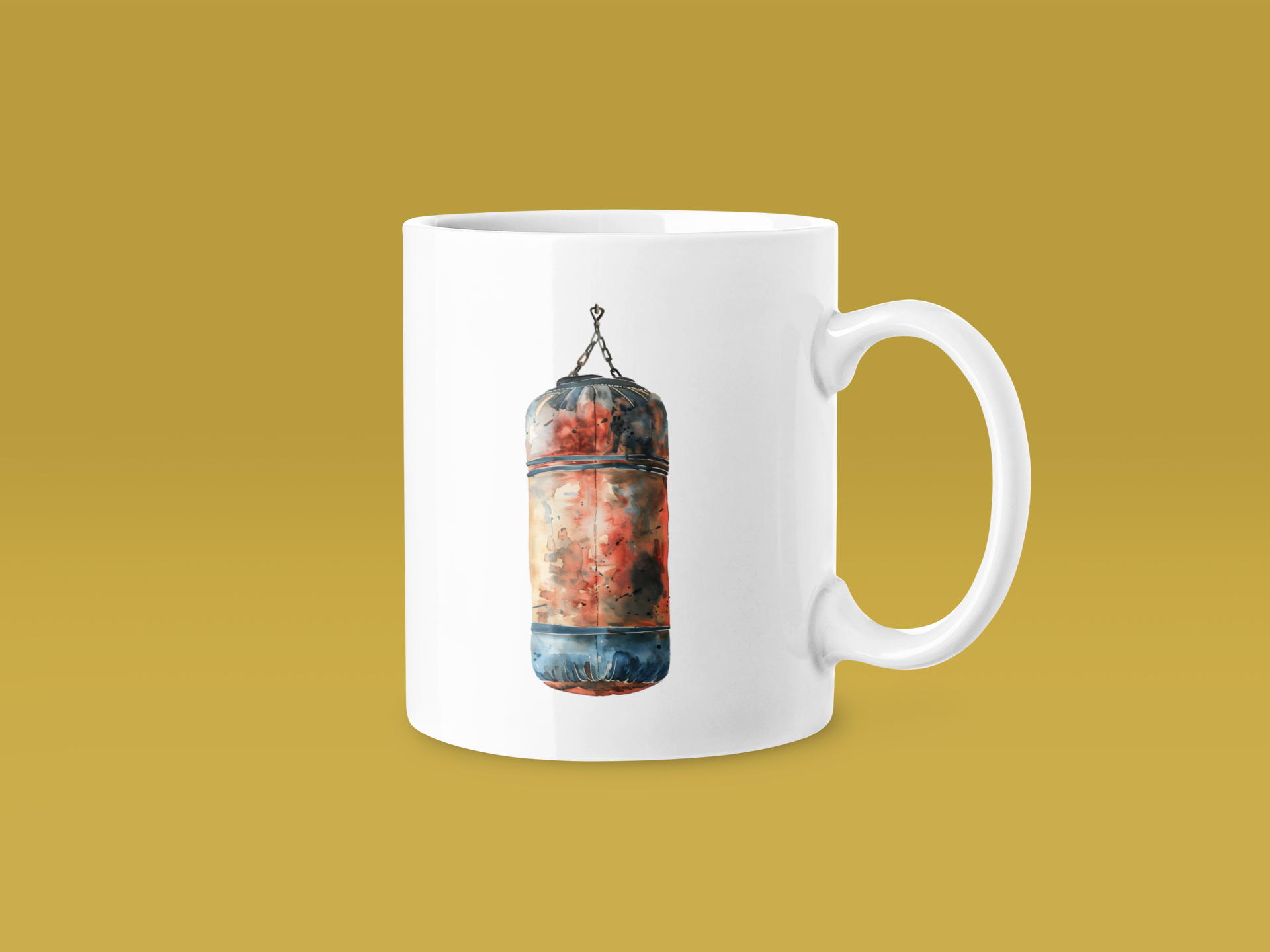 A battered red and blue heavy bag hangs center-stage on this mug—the iconic symbol of every boxing gym. Worn, textured, battle-scarred, yet standing strong.