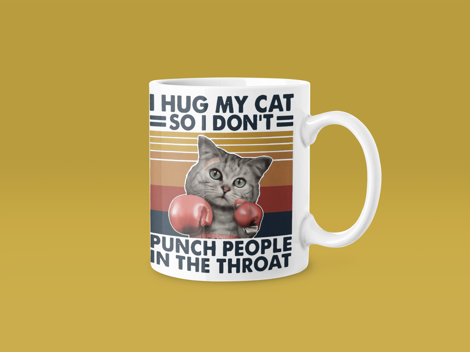 A playful, humorous design contrasting cute kitten behaviour with tough boxing attitude: Hug Cat, Punch People. The dual personality captured perfectly in bold typography and fun illustration.