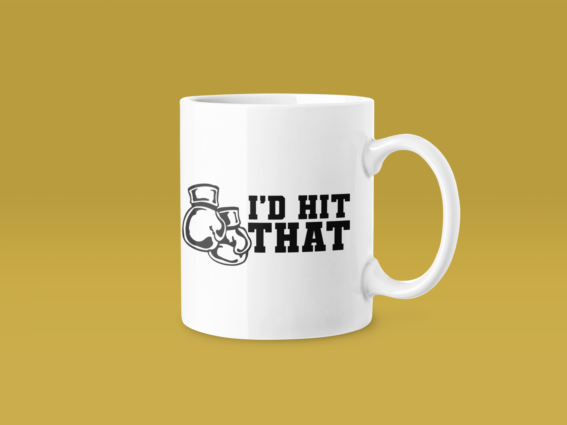 A cheeky double-entendre rendered in bold black block letters: ‘I’D HIT THAT’, with two grey-outlined boxing gloves positioned where ‘THAT’ would be, completing the punchy punchline. The gloves are rendered in clean outline style with minimal detail—just solid strokes defining the cuff, thumb, and palm area—creating a playful, minimalist visual that lets the text do the talking. This is humour that doesn’t try too hard, landing somewhere between gym banter and witty merch.
