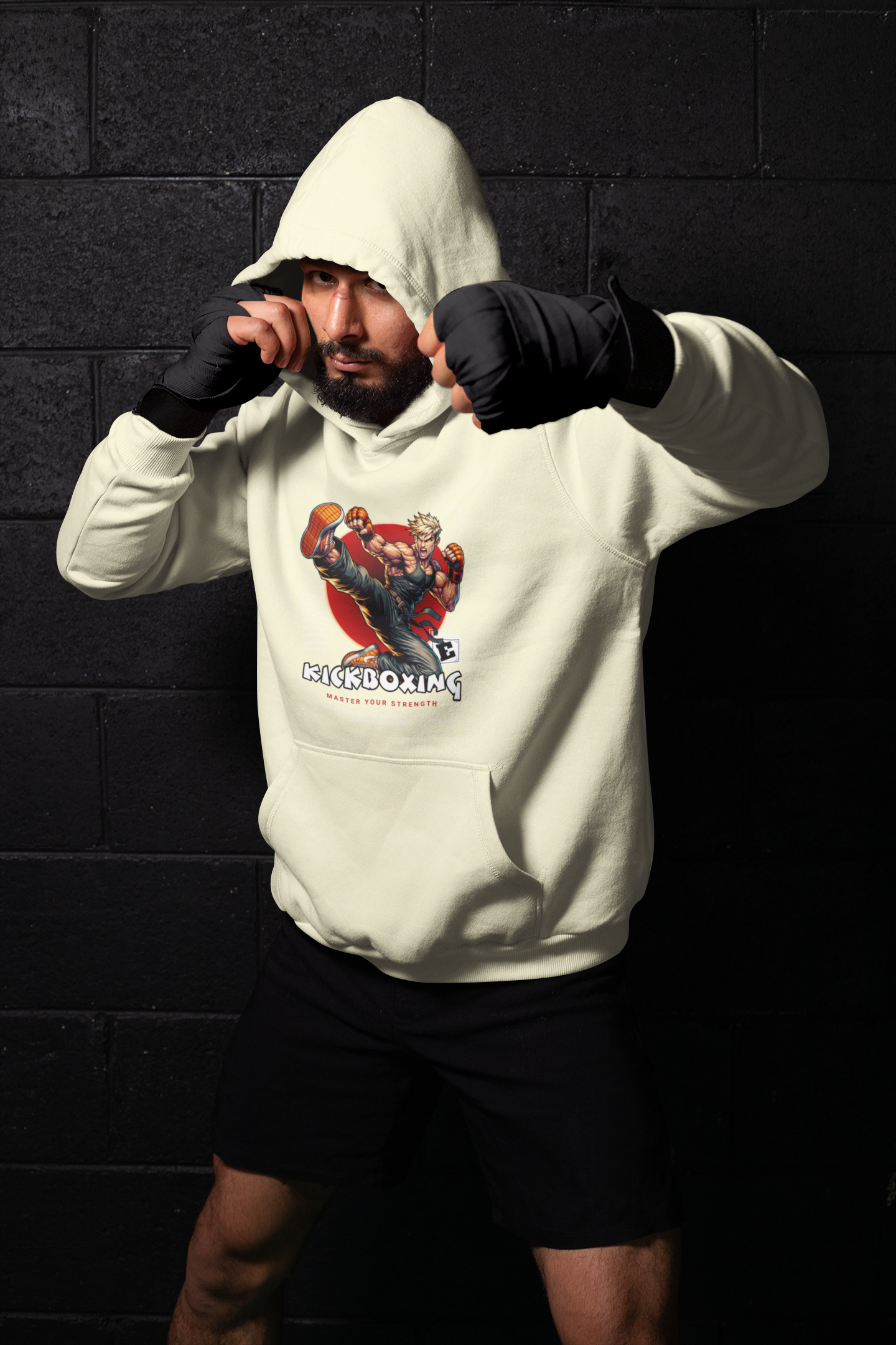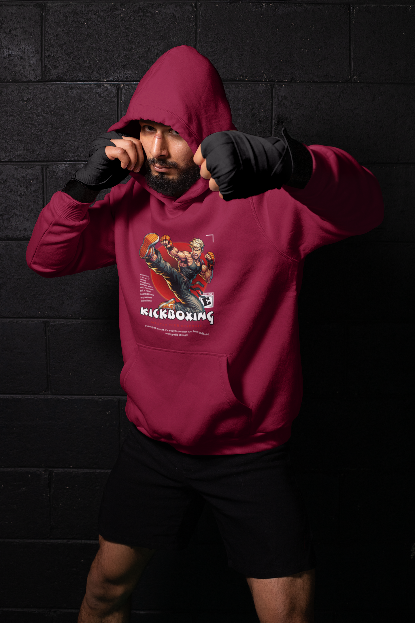 Premium kickboxing graphic boxing hoodie — heavyweight cotton-blend fleece with double-lined hood, ribbed cuffs, and bold graphic print. Available in Black, Burgundy, Cream, Forest Green, Grey, Navy, Red, White. Sizes S to 3XL. The perfect boxing gift for fighters and fans alike.