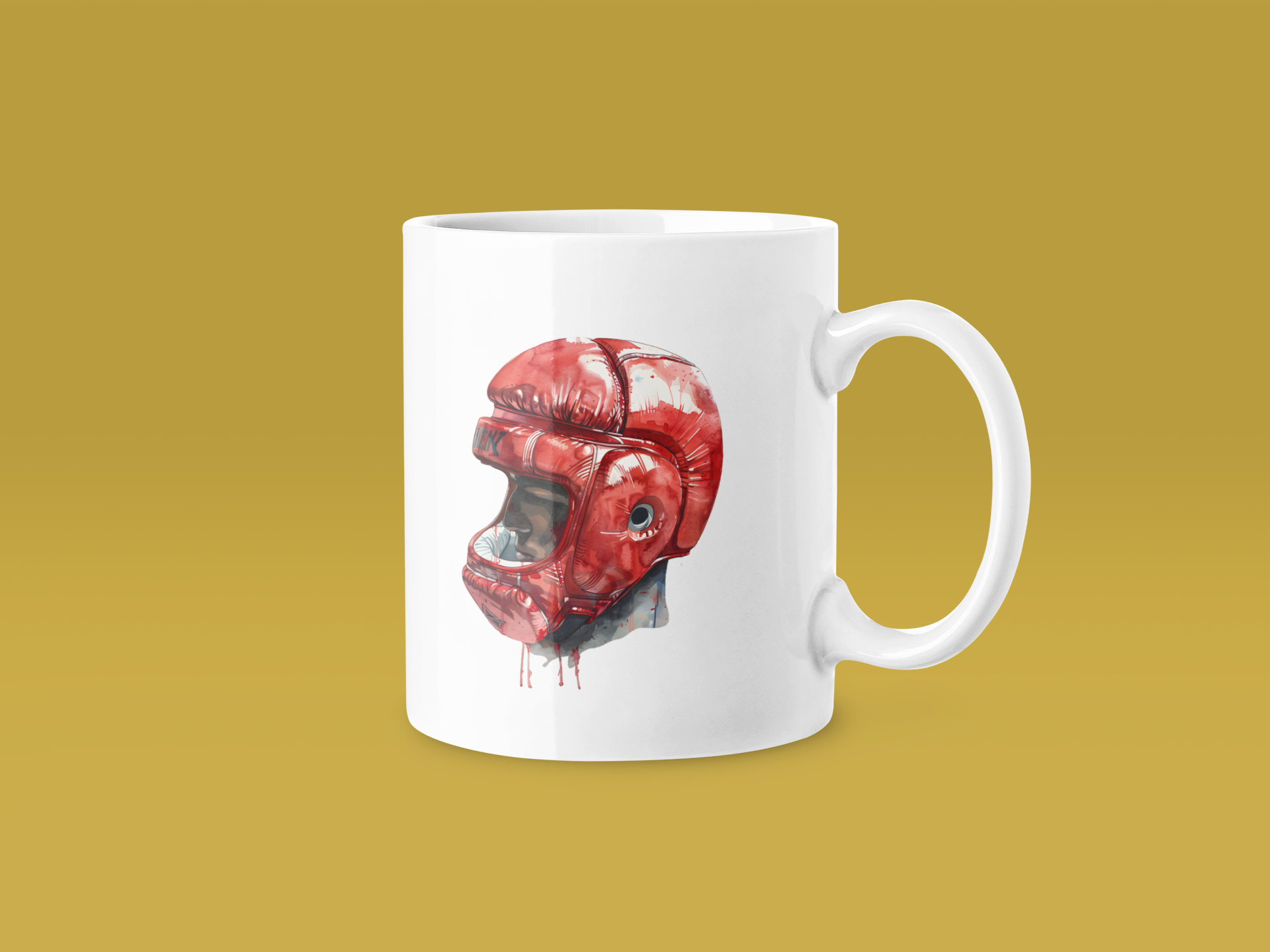 Red Boxing Headgear. The striking crimson colour signals serious training and competition preparation. This design celebrates the essential protective equipment that allows boxers to train aggressively and spar with confidence. The headgear is rendered clearly and professionally, showing the construction and straps that keep fighters safe.