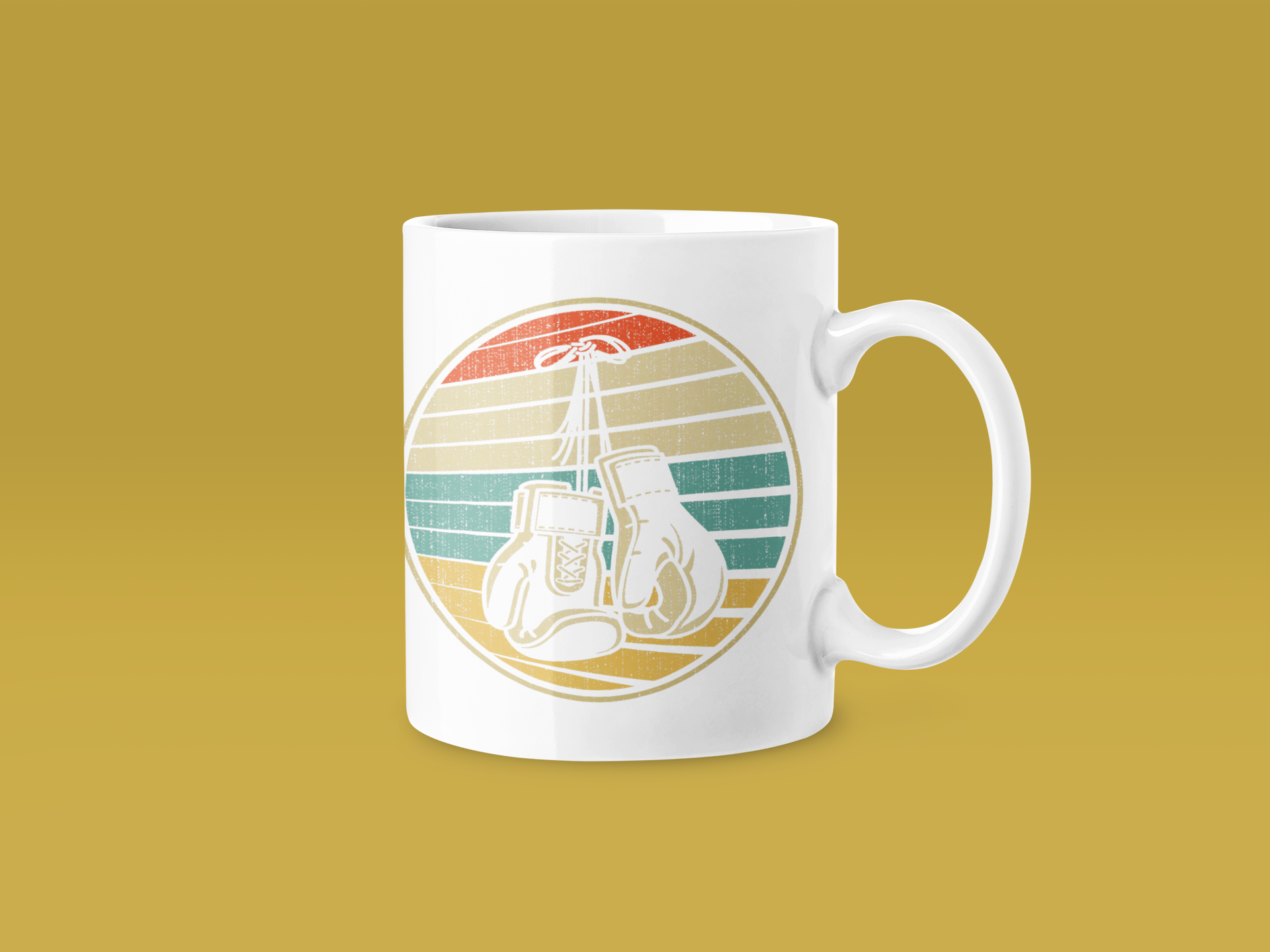 A nostalgic retro design featuring a pair of red boxing gloves against a soft-focus striped sunset backdrop in orange, gold, teal, and cream. Text reads ‘RETRO GLOVES SUNSET STRIPE.’ Dreamy, vintage, and evocative.