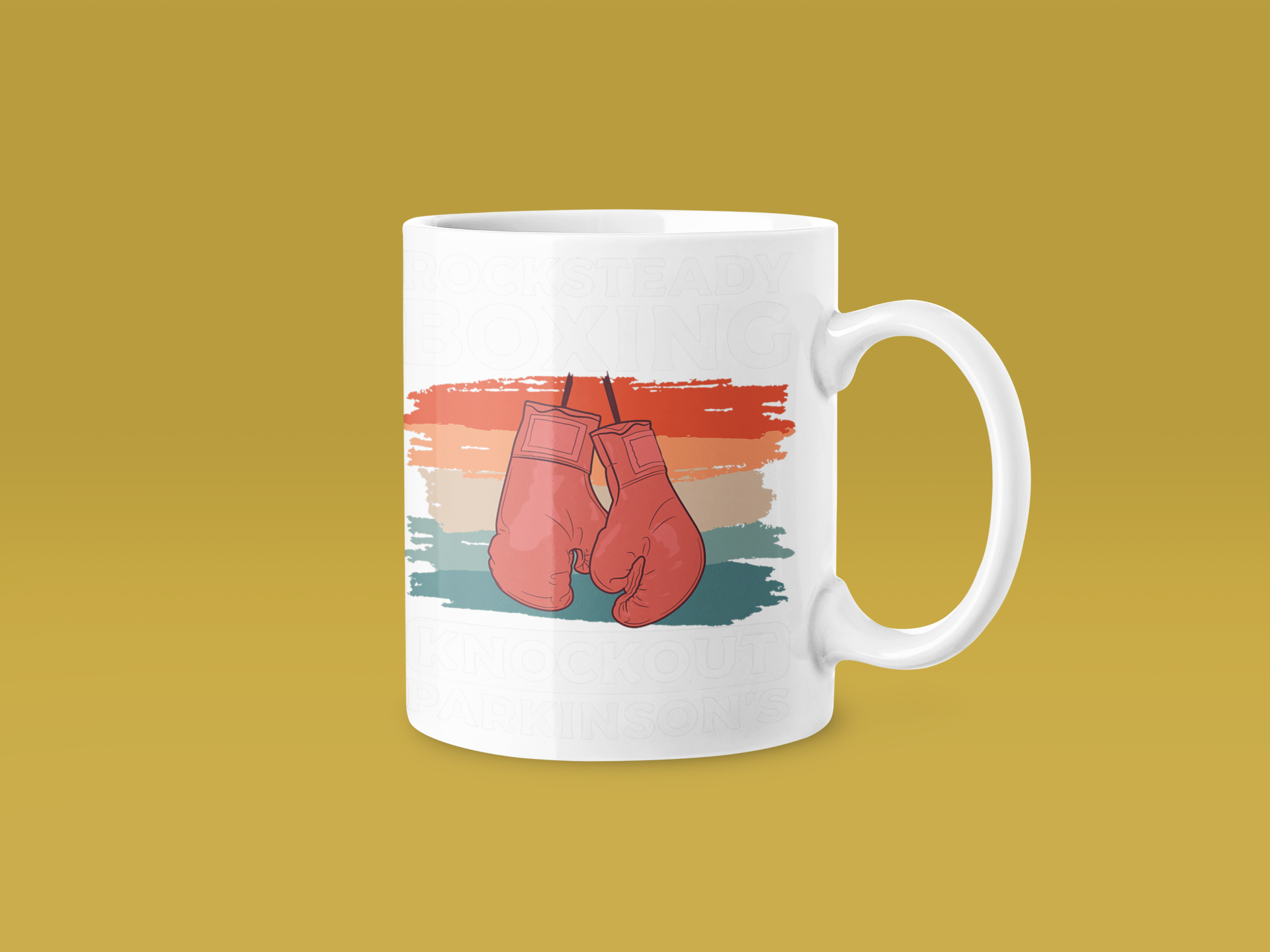 Design celebrating Rock Steady Boxing initiative. Boxer figure with gloves ready, surrounded by text ‘ROCK STEADY BOXING’ and ‘KNOCKOUT PARKINSONS.’ Teal and gold colour palette. Empowering, purpose-driven design.
