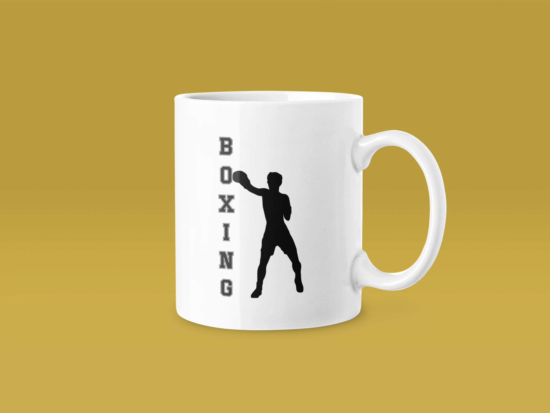 A jet-black boxer silhouette in a classic fighting stance dominates this clean, minimalist design, with the word ‘BOXING’ stacked vertically along the left edge in bold sans-serif letters. Set against crisp white ceramic, the silhouette’s powerful posture—fists raised, legs braced—captures the essence of ring work without a single unnecessary line. The high-contrast black-on-white design creates an image that reads instantly and clearly from any angle.