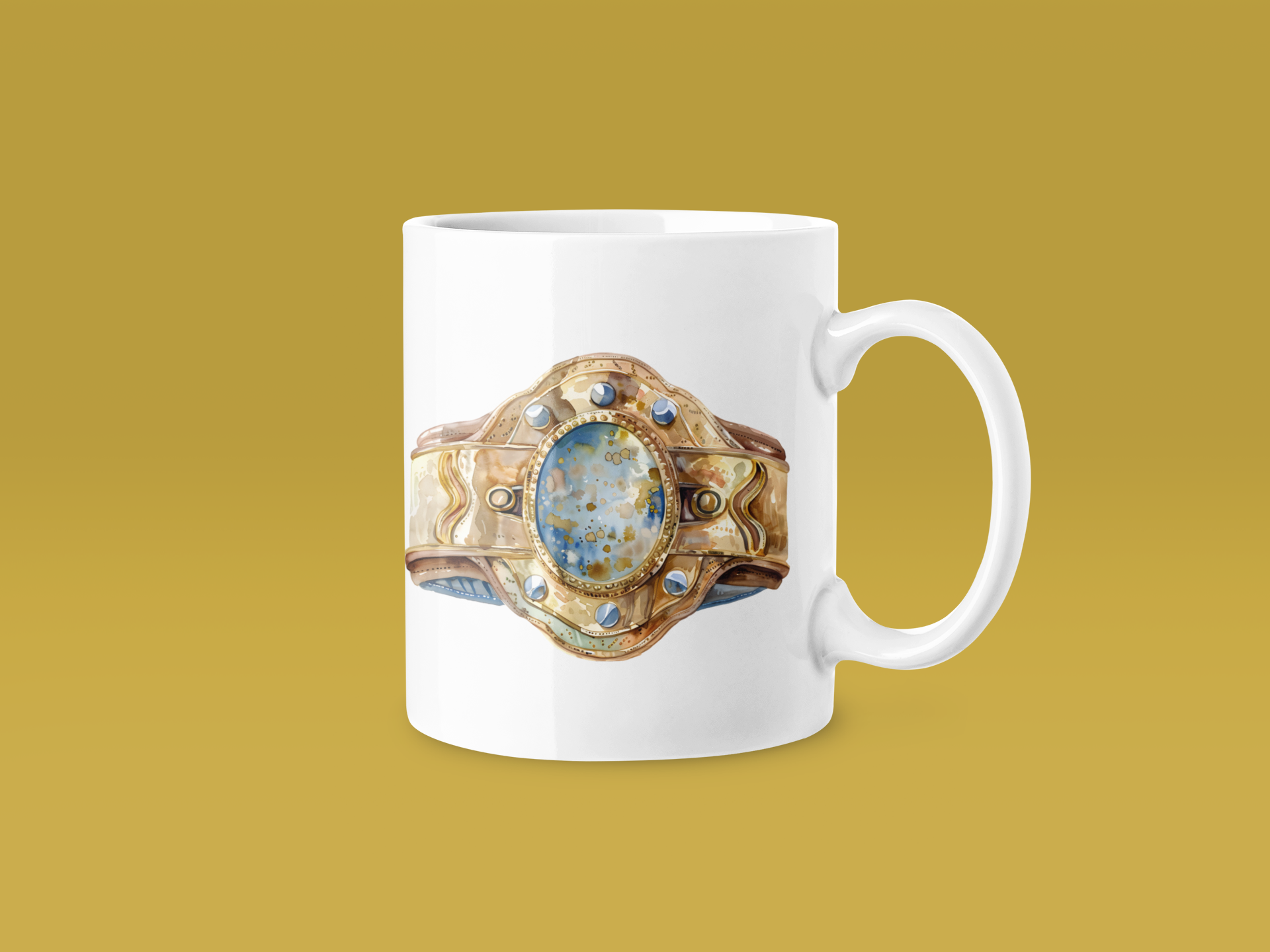 An elegant, vintage-inspired design centring on a gold championship belt buckle with blue gemstone inlay. Detailed ornamental details and classic design elements evoke timeless boxing prestige and championship glory.